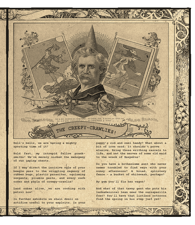 請容我指導你那拋媚眼拋得淋灕盡致的獵犬臉,去統治橡膠昆蟲、塑料寄生蟲、蠕動毒蛇、柔韌害蟲和所有型態和門類的毛骨悚然的爬爬!