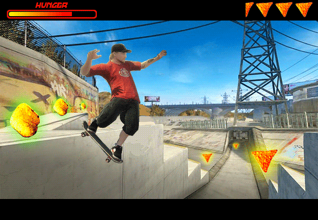 你開始為了你的「瘋狂零食喲」任務暴力地丟出一些異常野蠻的特技,把這過分暴增的飢餓指數控制住。基本上你的狗屎慾望已經飛離了束縛,看來那狗屎一點也不想要束縛,束縛在狗屎眼裡已經死了。