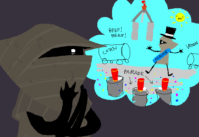 你喜歡成為鎮長的這個主意,你喜歡任何與鎮長有關的東西,還有那個關於有秩序的民主自治的主意。這一切對你來說是那麼有禮貌又合理。每個人都是那麼友好快樂,而且整個鎮運作得就像鐘錶一樣有序。政府的管理建立在領導層和民眾之間的彼此信任,但同時也是建立在擁有一位被大家所擁戴的,猶如英雄般勇敢的鎮長。