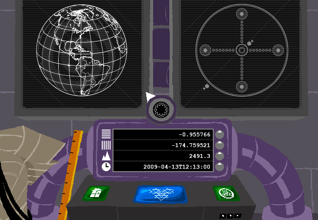 它有兩面大螢幕,但只有一面是啟用的。面板上有幾行數字,似乎可以用右邊的錶盤更改。有些數字已經作預設值填上了,可能是由先前的使用者輸入的。在下面是一些按鈕,最大的那個印着這個房間的標誌。