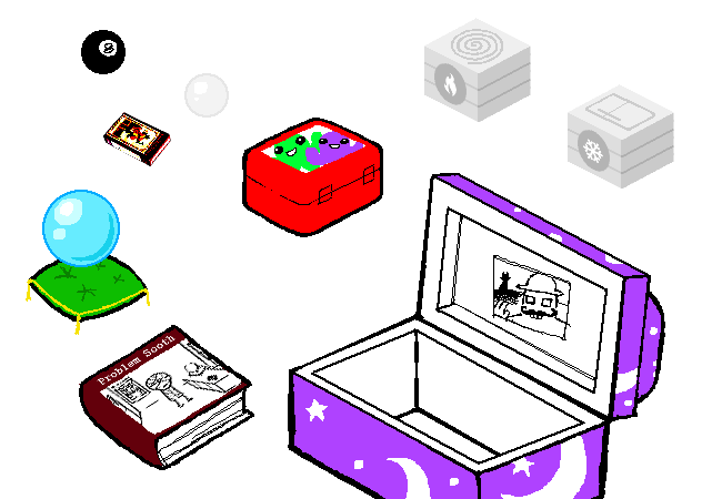 在算命玩意兒中有這些:一個附帶了天鵝絨枕的水晶球、一組塔羅牌、一顆魔法8號球、一顆魔法撞球母球,還有一本你最喜歡的書-《問題解決者》