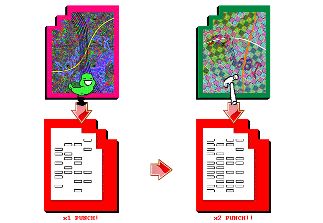雙打打孔卡創造出一種有著更多洞的孔式,比重疊兩張卡的要多。這給了你一種可行的辦法連結超過兩個物品而不用擔心洞太少的問題,或太多!只要混合重疊和聯集的卡片,組合就能突破天際。