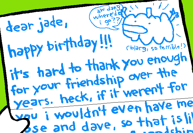 真的很難好好感謝你多年的友誼。見鬼,如果不是你我甚至都不會認識rose和dave,所以這就像,三倍的友誼!簡直就是友誼爆棚。哈哈。我真希望我能送你什麼值得彌補你給過我的,但是想當然那是不可能的。總之這裏有些蠢東西!
