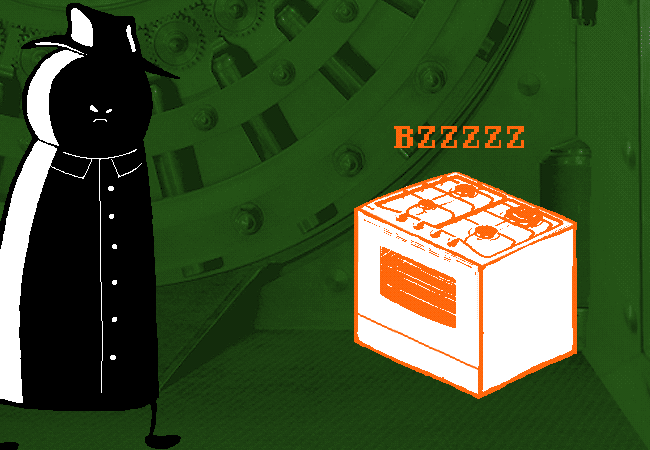 這白痴覺得他那特殊烤爐會根據他設定的時間把他傳送到未來。某種意義上,他是對了。實際上,他只是藏在烤爐裡直到計時器響起,然後跳出來。