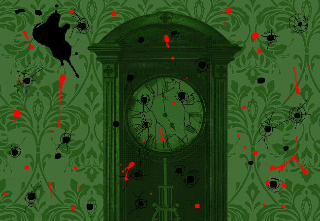 一個之前還沒有被打壞的鐘現在已經被彈孔和血液所覆蓋。