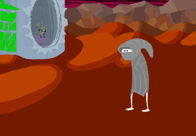 黃色繃帶傢伙似乎漫步到哪裡去了。但是高挑有著純白外觀的郵遞員大概會對你發現的有個詭異男孩在裡頭的大電腦感到興趣。
