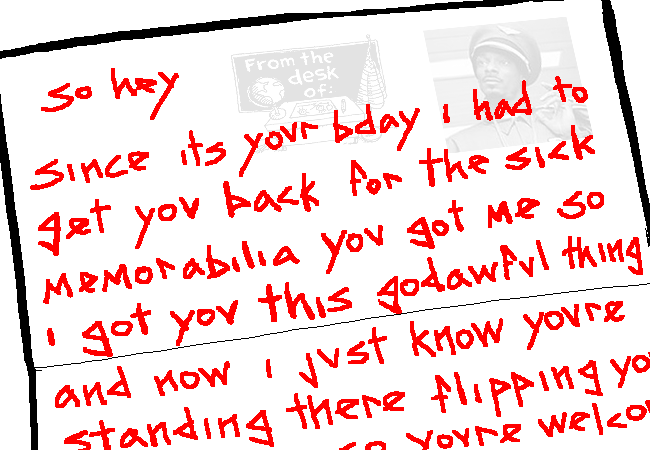 因為今天是你的生日所以我必須要送你這個神爛的東東來回敬你送我的靠腰紀念品然後我就知道你現在一定站在那邊歇斯底里所以不客氣喔.