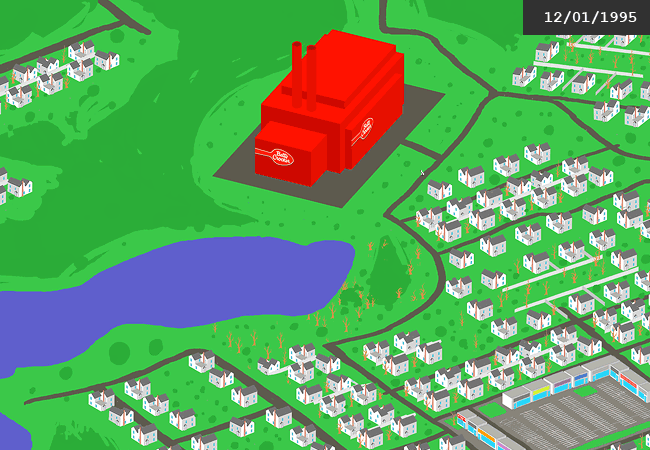 這螢幕顯示著美國西岸的一個小鎮,很顯然是你們的舊社區,但那裡有一個你沒見過的工廠。日期是1995年十二月一日,你出生的幾個月前。
