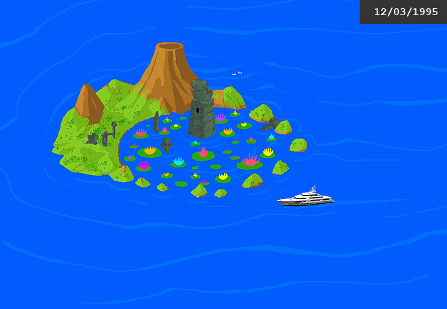 你用指令切換到另一個螢幕顯示著太平洋上偏遠島嶼的畫面,日期是1995年十二月三日。