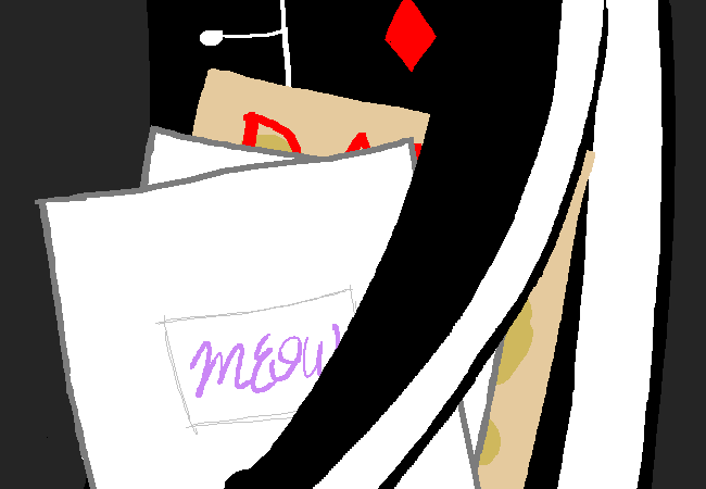 他看起來拿著些筆記本。還有一對看起來是被果汁弄髒的信封。
