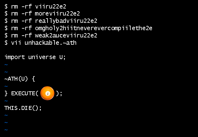 這是一個極度簡單的~ATH程式。他的主迴圈被綁定在宇宙的命程上。當宇宙死亡時,一個神秘的副程式將會被執行。你沒有辦法得知那段程式會做什麼。它是在伺服端被保護的部份中執行。完全無法破解。