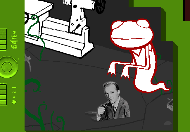 當她跟隨你的建議並且進行簡單的遊戲設置動作時,你沒理由的消失在她的顯示屏上。她看到了你毀壞的巢。她看到了她設置好的其它裝置。她看到了屋頂上古怪的電腦裝置,有著她不能辨認的一種種族在上頭。她甚至看到了一個巨大的青蛙頭獨自飛過在空中,並成為了青蛙精靈。