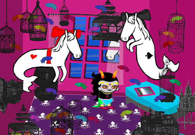 妳將會重新定義「殲滅」在Troll族社會中的含義,在你的統治之下,它將代表去照料每一位弱者與不適者,而不是撲殺他們。你已在試著實行這項計畫,並每日致力於殲滅深海動物。妳傾心於照護那些野生又漂亮的水生有蹄類,每天都會給牠們餵食和梳毛。妳捕捉並囚禁了數以千計的烏賊,這是為了牠們好,當然也因為牠們很有趣、很繽紛、而且你愛死了牠們,雖然牠們常常從籠子的柵欄間游出,不過也沒什麼大不了的。基本上妳都把這整座宮殿當成一種野生動物保育機構在運作,雖然牠們需不需要被照顧還蠻值得商榷的,而且妳做的其實也差不多就是個精心設置的角色扮演場景。不過還挺好玩的就是了。