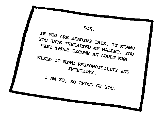 如果你讀到這個,這表示你已經繼承了我的皮夾。你已經確實成為一個大人了。