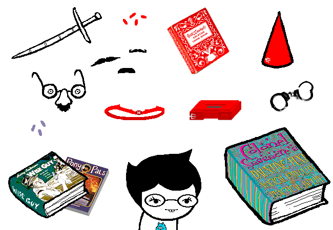這些是你在惡作劇時的基本道具,一些巧妙的偽裝、名牌尖頂帽、一本稍做刪節版的沙士卡文集(更新了一些更現代化的惡作劇,並拿掉部分有點惡劣過火的種族歧視笑話)、幾本被亂塞進來的書、你公司的原素碾磨工具12000的原型機,當然還有你超方便的虛假女繼承人專用腦波皇冠電腦(給那些剛走上初級麵糊大師之路的年輕人)