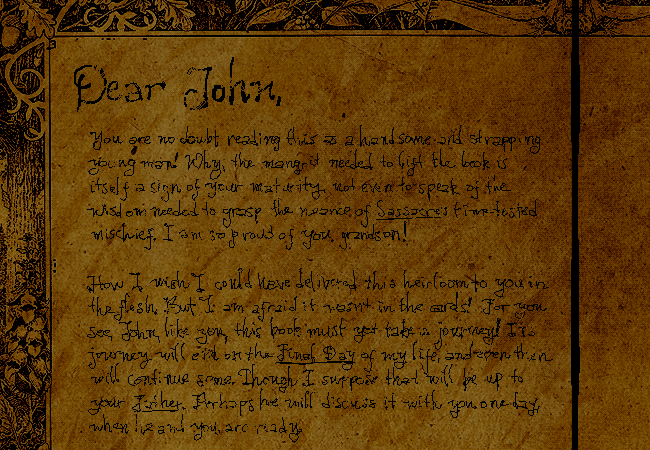 你一直以為這篇序文是你爺爺的奶奶寫的,她是一位很棒很棒的祖母,還創立了你幾年後即將繼承的公司。這段文字對你來說一直是個引人入勝的謎團,而對爺爺可能也是如此。從寫下的方式看來,這些話應該是奶奶假定在自己去世後才會被他看到。內容裡提到爺爺參與了一場冒險,你很好奇這是否真的發生過,或這隨筆只是一位來自值得驕傲的惡作劇世家的老婦人她最後的戲言。她接著寫了很多聽起來很奇幻的東西,說是爺爺即將在旅程中碰到的事,比方特務、流放者、嘍囉、永住者和氣息之後裔和光明之先知之類的東西。等等...你朋友是不是也提過這些?