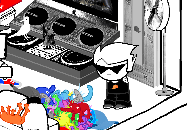 你床腳下的物品堆,組成有帽子、幾個零散的機器部件,還有扑偶仔。扑偶仔是你自己設計的可愛毛絨玩偶。你愛玩偶的一切。你總是想著自己的生產工藝、它們的操作、酷炫嶄新的設計,諸如此類的。如果宇宙對你沒有更重要的安排,還有如果這世界不是如此操蛋,你會以玩偶企業名利雙收,就像你哥用他那些詭異狗屎爛蛋做的一樣。