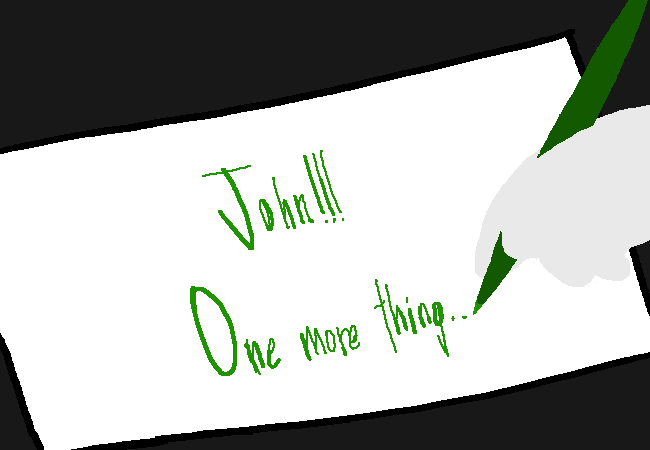 你用最後的幾句友善的詞語完成了你的紙條,並模糊地表示了你的真實身份。你遵循著外星朋友的建議維持住一些祕密,好讓它不會產生時空問題,但保守祕密什麼的真的很難啦。你手癢偷偷地穿插了一個細微的提示說你的祖母其實就是他的朋友Jade。嘻嘻。你幻想著如果John對事情有你的一半敏銳,他就一定會看得出來。這沒關係的,就只是個你和他之間的小祕密,那位假裝英國人的外星人不會知道這些。