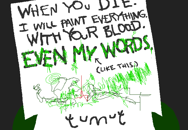 (等你一死我就要拿你的血來當顏料作畫,甚至用在我的字上! ↑(像這樣))