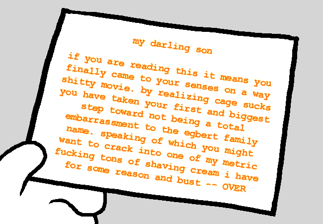 如果你看到這張字條表示你終於有分辨爛電影的意識了. 覺得凱吉很廢是你不再成為egbert家族之恥重要的一步. 說到這個你應該會想拿起一罐我不知為何囤積的一他媽公制單位-頓的刮鬍泡然後 -- 翻面