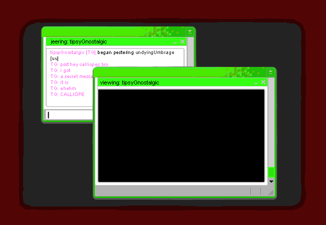 你看了一眼訊息。沒錯,就如同你想的一般。又是那爛醉的妓女無厘頭的廢話噴滿整個畫面。看來是你姊妹告訴了那位人類她的名字?這很明顯是一項非常嚴重的違規行為。她肯定是絕望了。
